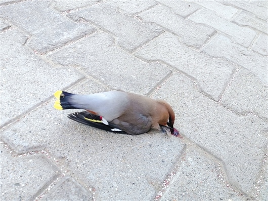 接到居民的反映,社區(qū)工作人員也前往現(xiàn)場進(jìn)行查看并取樣,對(duì)于其他的鳥類尸體進(jìn)行處理并做好消毒措施,接下來將對(duì)其做進(jìn)一步鑒定檢測。社區(qū)也聯(lián)系到了包頭市生態(tài)濕地保護(hù)管理中心野生動(dòng)植物保護(hù)室,該室蘇股長到達(dá)現(xiàn)場后,進(jìn)行了初步觀察和判斷。這些鳥類為太平鳥,是遷徙過境包頭。就在記者采訪期間,有一群太平鳥在樓棟附近起飛,但因?yàn)樗俣群芸?,有的鳥直接撞到了附近的樓體上,發(fā)出很大聲響,物業(yè)工作人員前往查看,發(fā)現(xiàn)一只太平鳥掉落在地?!斑@只鳥看起來沒有外傷,應(yīng)該只是撞蒙了,這是我撿到的第四只活著的鳥?!蔽飿I(yè)工作人員說,其余3只已放飛。