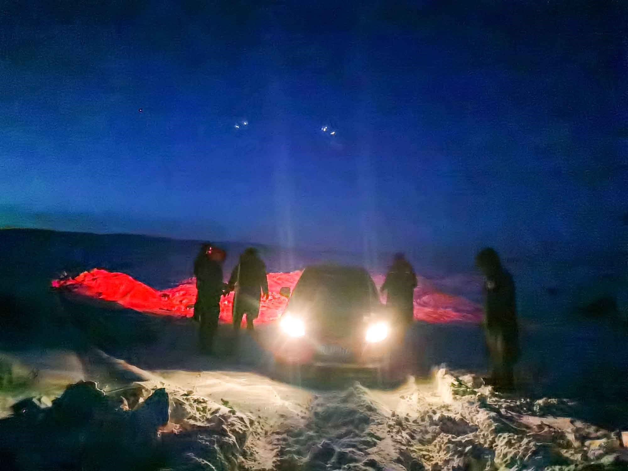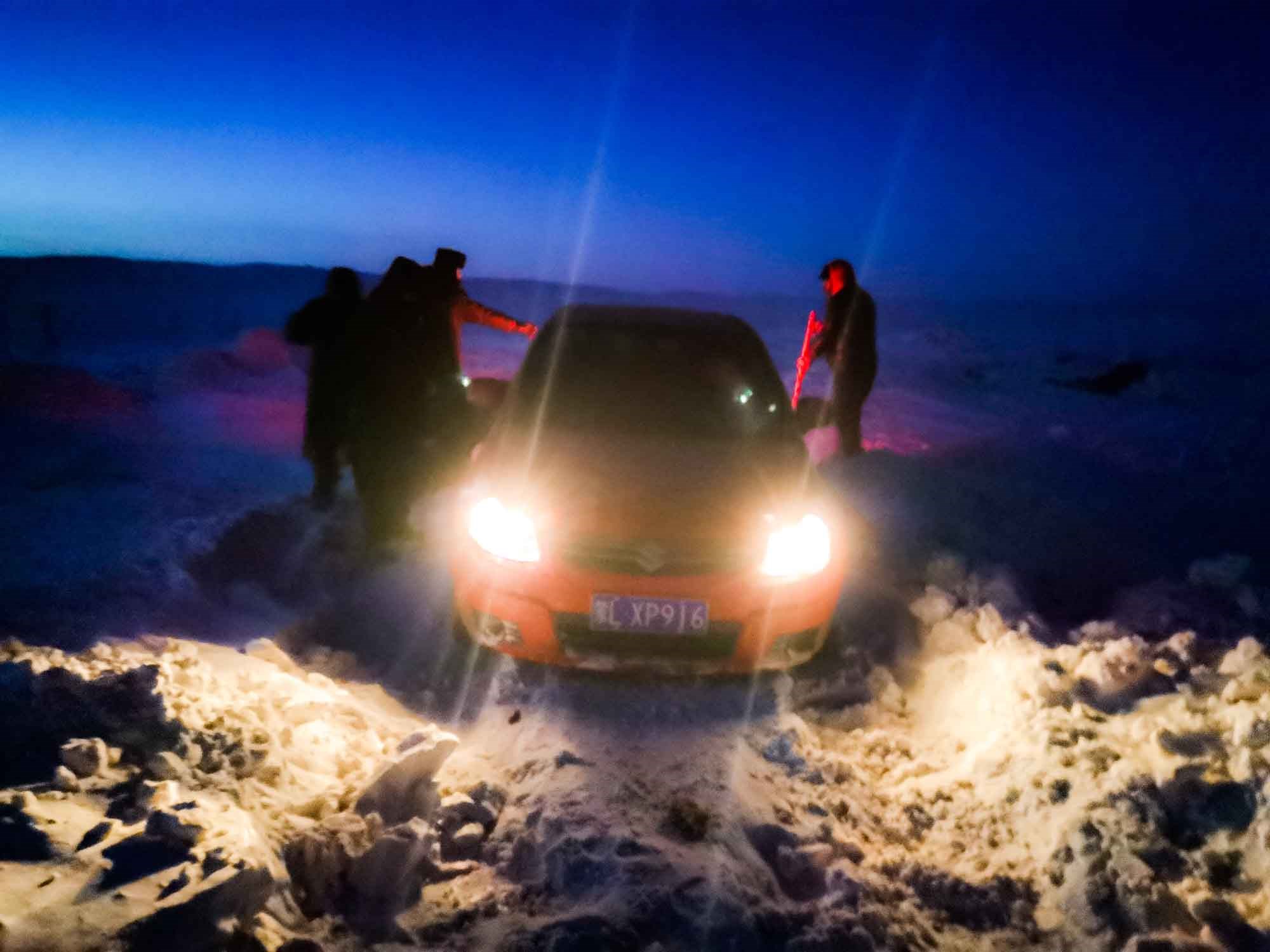 1月17日17時,那木吉拉與弟弟一同駕車返回百靈廟鎮(zhèn),在途經(jīng)一處被風(fēng)谷地時,由于晚上視線較差,且此處坡度較大,不慎陷入雪中無法動彈,只得撥通電話請求派出所救助。草原上沒有遮蔽物,常常到了下午就刮起大風(fēng),吹得積雪覆蓋在土地上分不清地勢高低,民警們按著平日下鄉(xiāng)走訪的經(jīng)驗摸索前進,經(jīng)過近一小時才到達現(xiàn)場,了解情況后,民警們將準(zhǔn)備好的熱水和棉大衣遞給牧民便展開了救援工作。在零下35度的冬夜里,民警們用鐵鍬和雙手經(jīng)過近兩個小時的奮戰(zhàn)終于將40厘米厚的積雪清理干凈,并將被困車輛通過前拉后推的方式移至平坦區(qū)域。