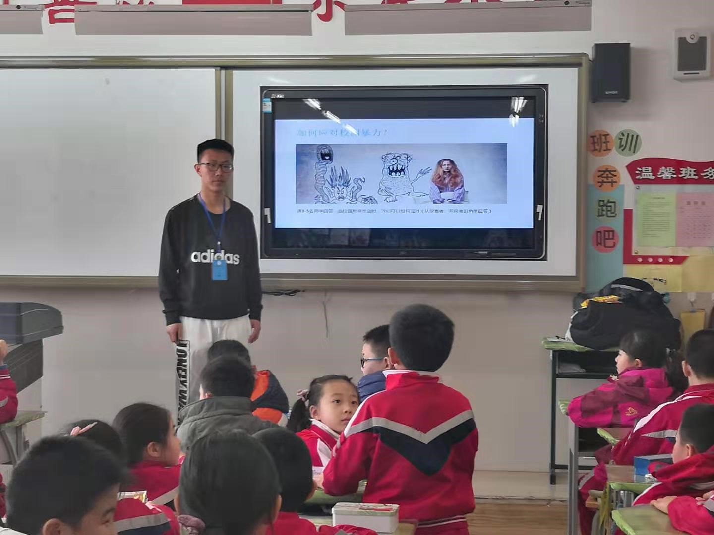 只見(jiàn)一個(gè)長(zhǎng)相魁梧的“歹徒”不僅擋住同學(xué)們回家的路,還口出狂言。而路過(guò)的幾名同學(xué)正不知所措。原來(lái)這是由北垣小學(xué)的師生們正在進(jìn)行校園暴力演習(xí),且當(dāng)天還邀請(qǐng)了52位律師走進(jìn)校園,為同學(xué)們上了一堂生動(dòng)的法律常識(shí)課。