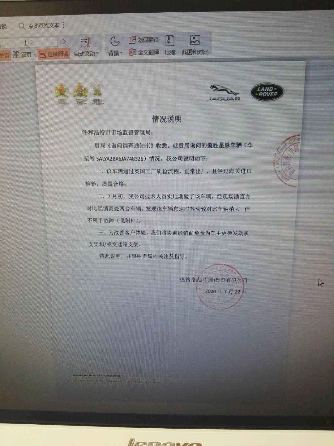 在多個車輛專區(qū)的貼吧里,均有關于該車型抖動,共振的情況反映。2019年,杭州30多名路虎星脈車主因為車輛共振導致耳鳴的問題,還共同趕到路虎上??偛考w維權。此事經(jīng)杭州媒體全程曝光,引起廣泛關注。盡管如此,捷豹路虎(中國)投資有限公司給出的答復和此次給呼和浩特市市場監(jiān)督管理局的《情況說明》如出一轍,都表示非質(zhì)量問題。