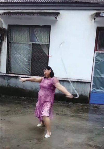 “清水河”大媽與抖音的相遇是在3年前。當時,遭遇了親人離世的她悲傷難抑,為了讓她分散注意力,她的女兒幫她下載了抖音。此后,大媽時常刷刷抖音,也慢慢從中悟出了一個道理,就是生活中不如意十之八九,人要好好活著,要快樂地活著。很快,大媽就從悲傷中走了出來,也學著在抖音上拍攝自己的日常。雖然起初視頻點贊量不多,但能記錄下生活的點滴足以讓她格外開心。一直到了去年9月份,大媽無意之中發(fā)布了一條雨中甩鞭子的視頻。視頻中,大媽身著一襲紅裙,有節(jié)奏地甩起了十幾斤重的鐵制麒麟鞭?!芭距?、啪嗒、啪嗒……”聲聲響亮、威風凜凜。就是這條視頻讓她一夜爆紅。此后短短幾天,這條視頻的點贊量就突破了200萬,一時間,抖音上還掀起了一陣和大媽合拍的熱潮。