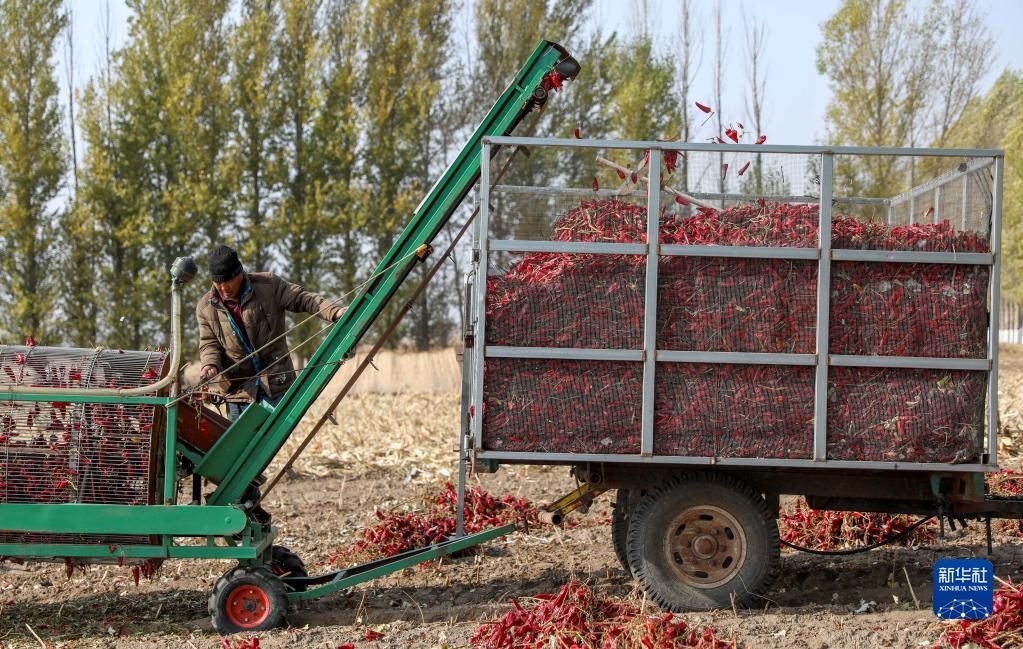10月25日,在開魯縣東風(fēng)鎮(zhèn)東方紅村,村民收獲紅干椒。新華社記者 連振 攝