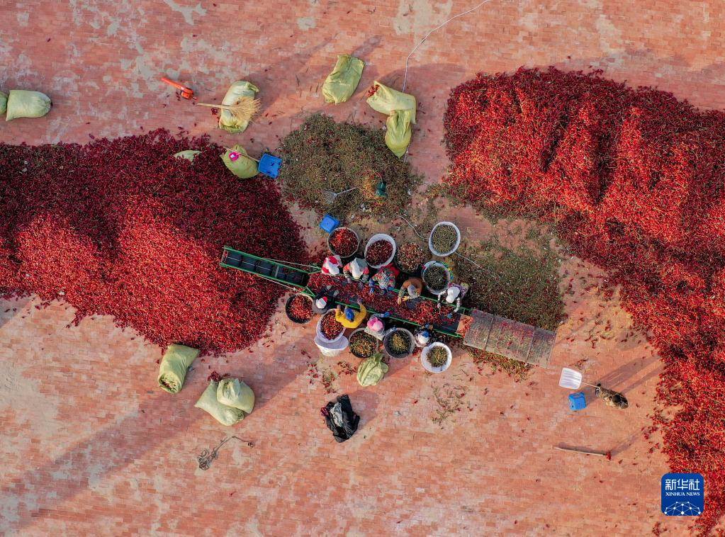 10月25日,在開魯縣東風(fēng)鎮(zhèn),工作人員分揀處理紅干椒(無人機(jī)照片)。新華社記者 連振 攝