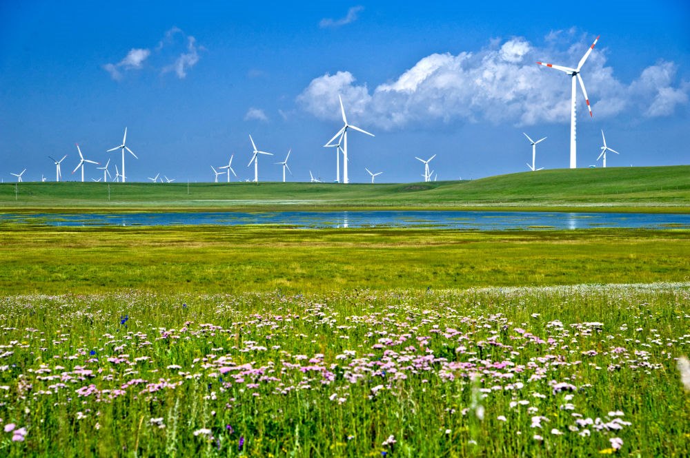 “輝騰錫勒”蒙古語意為“清涼的山崗”,因風力資源豐富而得名,是建設風電場理想的場所。如今,一排排風電機猶如“白色森林”,碩大的風翼就像一架架“大風車”,在草原勁風吹動下緩緩轉(zhuǎn)動,形成另一大景觀。