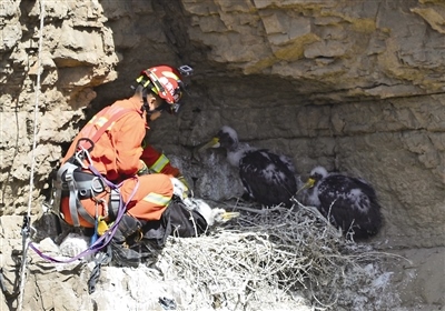 當天7時左右,在烏海市海勃灣區(qū)甘德爾山景區(qū)半山腰處,攝影愛好者焦長青在拍攝時發(fā)現(xiàn)了一窩出生20多天的幼年野生黑鸛,其中一只黑鸛行動異常,疑似受傷。他立即撥打了119報警電話,同時聯(lián)系了烏海市野生動物保護部門。9時許,烏海市消防支援支隊光明路特勤站和烏海市野生動物保護部門的工作人員到達現(xiàn)場。經(jīng)勘查,在距離懸崖正下方大約30米處的巖洞內,一只幼年黑鸛被尼龍繩纏繞住腿部而受傷,不能行動。消防員隨后尋找合適的位置制作錨點。消防員陳意攜帶救援裝備速降到懸崖下方展開營救,一個小時之后,受傷的幼年黑鸛被成功救出,并送往海勃灣區(qū)林業(yè)草原局救助站進行救治。