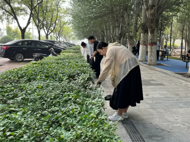 田永成今年66歲,精神矍鑠,手里拿著一把夾子,彎著腰仔細(xì)地在草坪上搜尋垃圾。“看到‘美城有我’城市清潔日行動的倡議書,我立馬就給隊(duì)員們打了電話,大家都特別積極,好多人報名參與?!碧镉莱尚χf,額頭上的汗珠順著臉頰滑落。