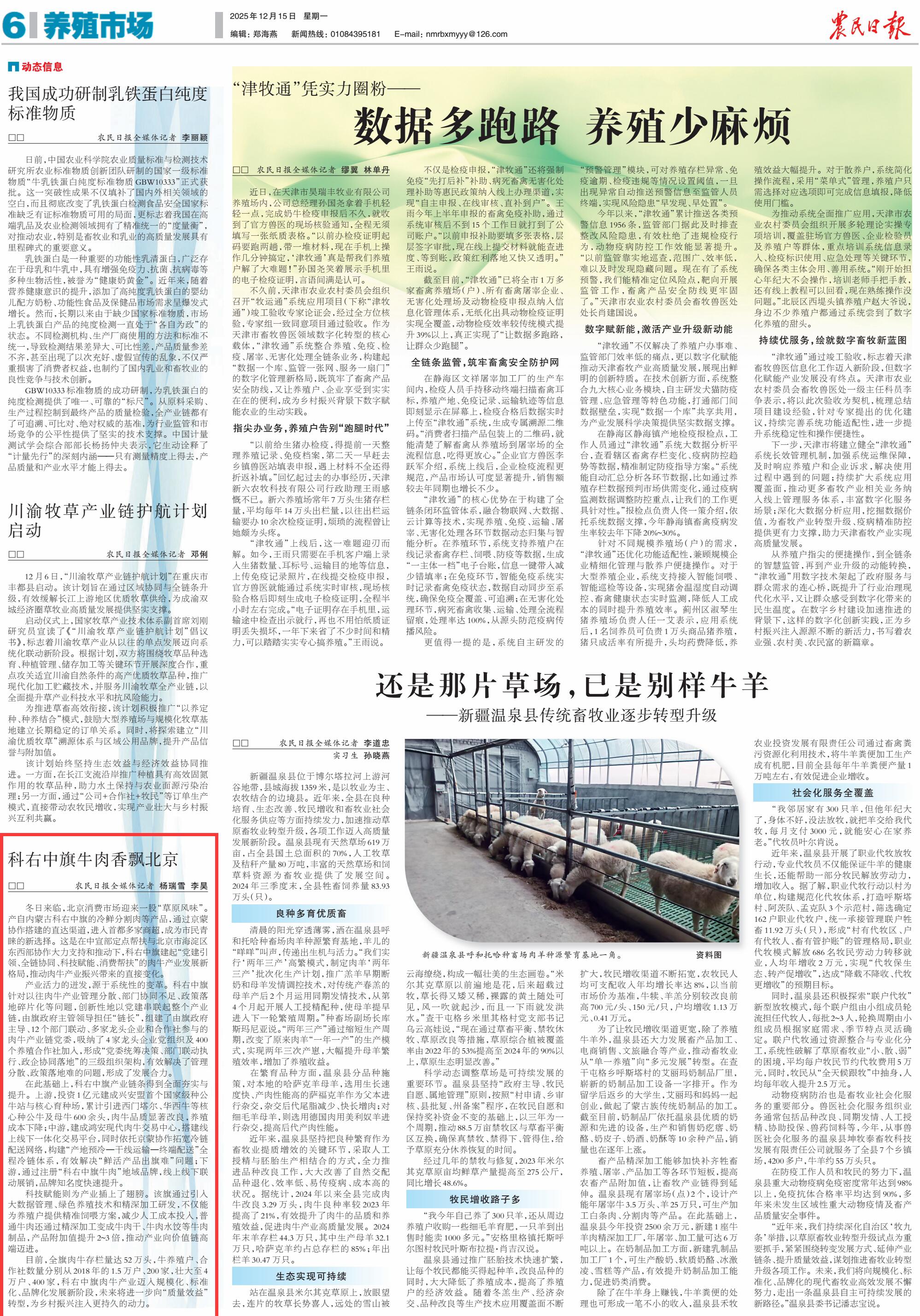 2025年12月15日《農(nóng)民日報》第6版刊發(fā)了《科右中旗牛肉香飄北京》的文章,報道了產(chǎn)自內(nèi)蒙古科右中旗的冷鮮分割肉等產(chǎn)品,通過京蒙協(xié)作搭建的直達渠道,進入首都多家商超,成為市民青睞的新選擇。這是在中宣部定點幫扶與北京市海淀區(qū)東西部協(xié)作大力支持和推動下,科右中旗建起“黨建引領(lǐng)、全鏈協(xié)同、科技賦能、消費幫扶”的肉牛產(chǎn)業(yè)發(fā)展新格局,為鄉(xiāng)村振興注入更持久的動力。