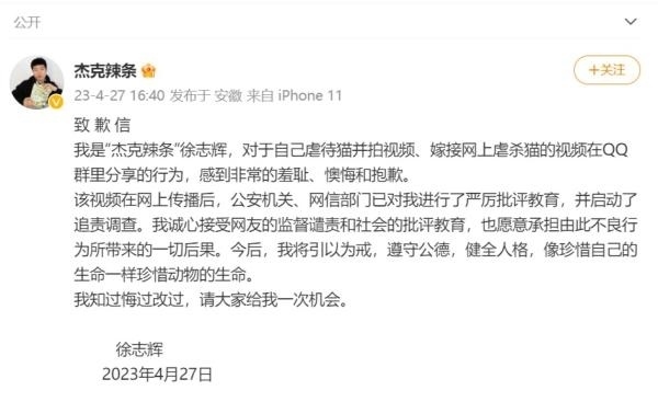 27日16時40分,@杰克辣條 在微博發(fā)表了署名“徐志輝”的致歉信稱,對于自己虐待貓并拍視頻、嫁接網(wǎng)上虐殺貓的視頻在QQ群里分享的行為,感到非常的羞恥、懊悔和抱歉。該視頻在網(wǎng)上傳播后,公安機(jī)關(guān)、網(wǎng)信部門已對其進(jìn)行了嚴(yán)厲批評教育,并啟動了追責(zé)調(diào)查。