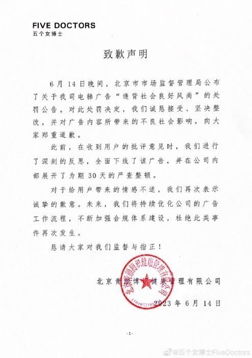 6月14日晚,“五個(gè)女博士”也在其微博發(fā)布致歉聲明稱,對(duì)此處罰決定,誠(chéng)懇接受、堅(jiān)決整改,并對(duì)廣告內(nèi)容所帶來(lái)的不良社會(huì)影響,向大家鄭重道歉。