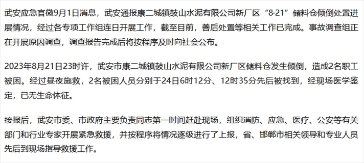 ·河北武安:一水泥廠(chǎng)儲(chǔ)料倉(cāng)發(fā)生傾倒致兩人死亡。
