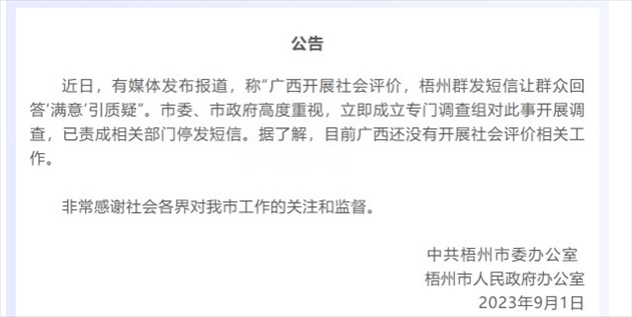 ·網(wǎng)傳廣西開(kāi)展社會(huì)評(píng)價(jià),梧州群發(fā)短信讓群眾回答“滿(mǎn)意”,梧州市政府:開(kāi)展調(diào)查,已責(zé)成相關(guān)部門(mén)停發(fā)短信。據(jù)了解廣西還未開(kāi)展社會(huì)評(píng)價(jià)相關(guān)工作。