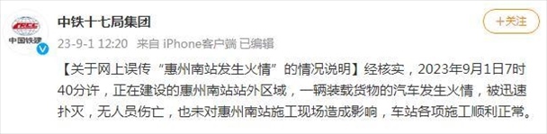 ·中鐵十七局集團(tuán)發(fā)布對(duì)“惠州南站發(fā)生火情”的說(shuō)明:一輛裝載貨物的汽車(chē)發(fā)生火情,被迅速撲滅,未造成人員、財(cái)產(chǎn)傷亡。