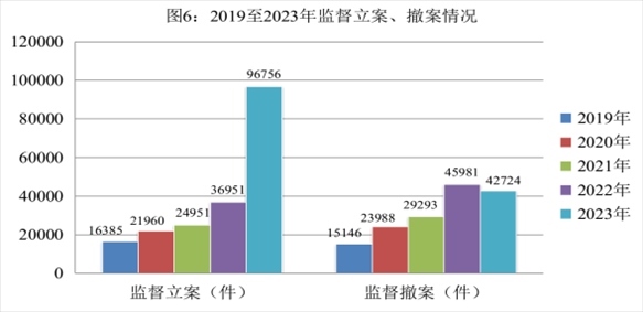 全國(guó)檢察機(jī)關(guān)共監(jiān)督立案96756件,同比上升1.6倍。監(jiān)督立案后起訴29974人,同比上升89.7%。作出生效裁判25693人,同比上升82.7%,其中,判處有期徒刑以上刑罰25259人,判處有期徒刑以上刑罰率98.3%,同比增加0.9個(gè)百分點(diǎn)。監(jiān)督撤案42724件,監(jiān)督撤案率100%,同比增加0.1個(gè)百分點(diǎn),呈逐年上升趨勢(shì)。