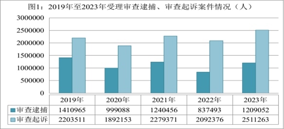 隨著新冠疫情防控轉(zhuǎn)段,我國(guó)經(jīng)濟(jì)回升向好,社會(huì)活躍度增加,同時(shí),檢察機(jī)關(guān)與有關(guān)部門一道依法從嚴(yán)懲處電信網(wǎng)絡(luò)詐騙等嚴(yán)重影響人民群眾安全感的犯罪,刑事犯罪案件總量增長(zhǎng)。2023年,全國(guó)檢察機(jī)關(guān)受理審查逮捕各類犯罪828999件1209052人,同比分別上升49.8%、44.4%。審查后共批準(zhǔn)逮捕72.6萬(wàn)人,同比上升47.1%;受理審查起訴各類犯罪1786635件2511263人,同比分別上升19.7%、20%。審查后決定起訴168.8萬(wàn)人,同比上升17.3%。