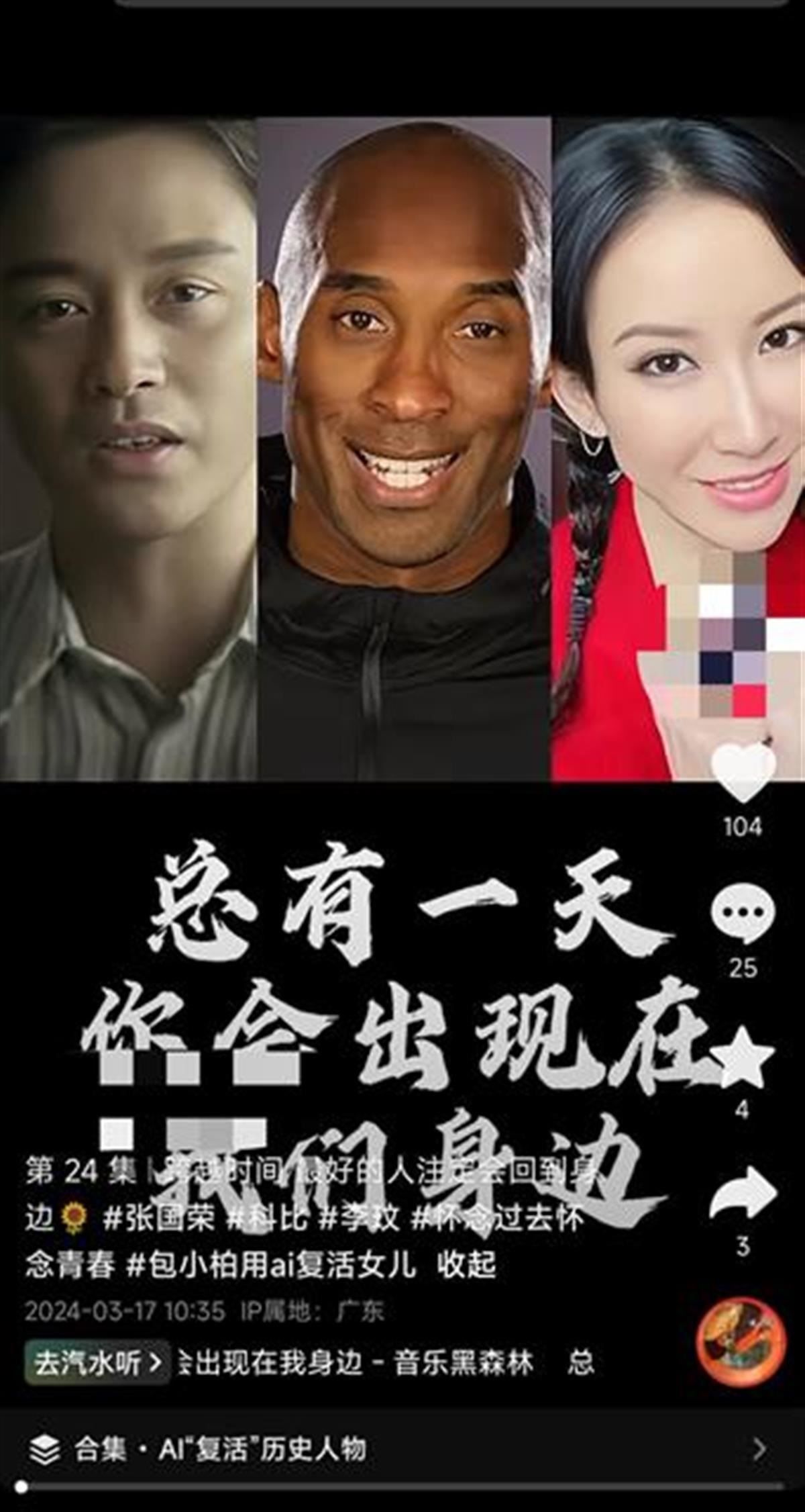 在社交平臺(tái),類(lèi)似的“AI復(fù)活師”賬號(hào)仍在活躍。這些賬號(hào)通過(guò)發(fā)布科比、李玟、張國(guó)榮等已逝名人的AI視頻吸引觀(guān)眾,并在簡(jiǎn)介中聲稱(chēng)可以通過(guò)AI技術(shù)定制數(shù)字人、克隆聲音、修復(fù)照片,還能“復(fù)活”已逝親人,定制他們的音頻視頻。目前,部分“AI復(fù)活師”的視頻已被平臺(tái)標(biāo)注“內(nèi)容疑似AI生成,請(qǐng)謹(jǐn)慎甄別”。