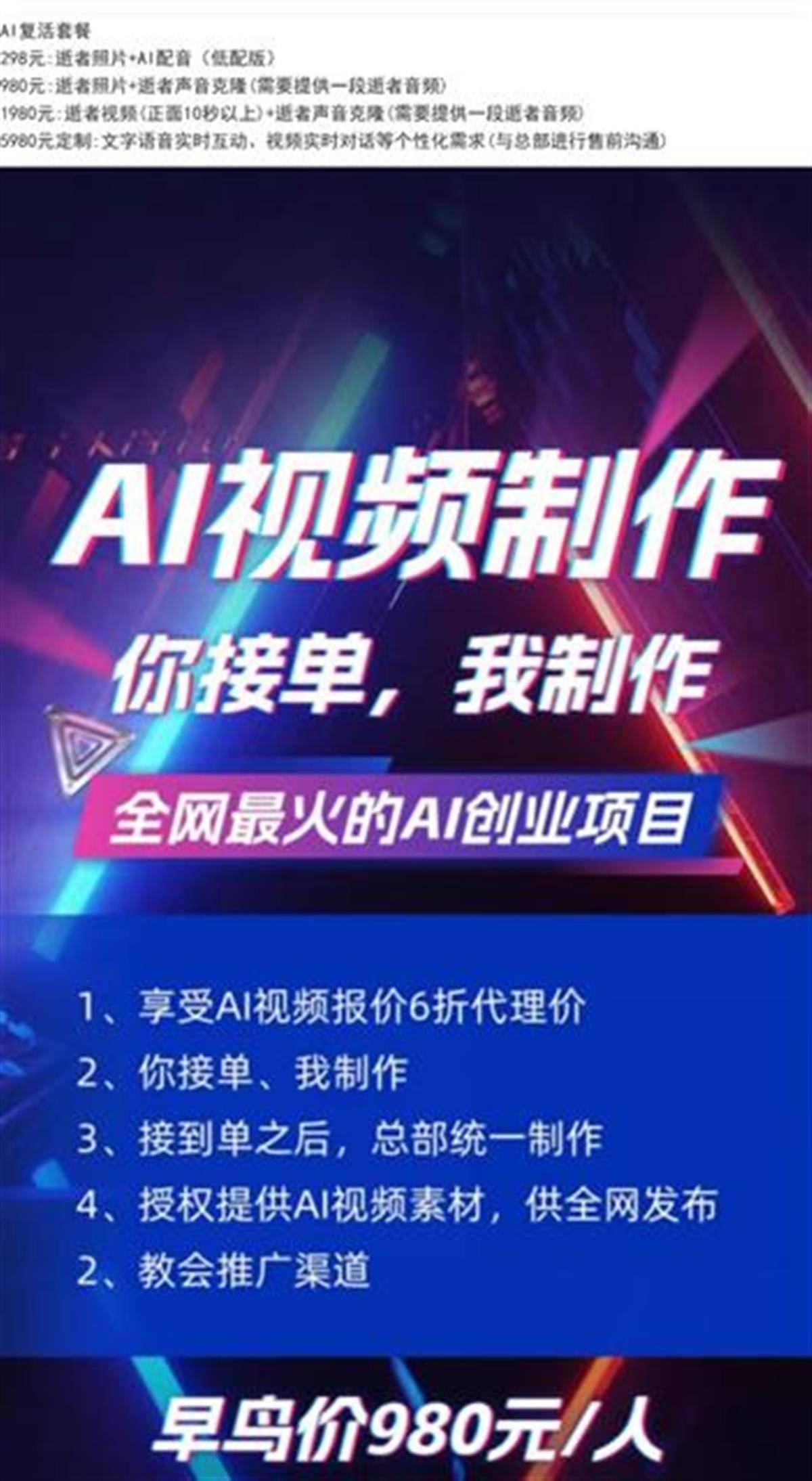 記者私信其中一名“AI復(fù)活師”詢(xún)問(wèn)能否制作已逝明星的定制說(shuō)話(huà)視頻,對(duì)方表示可以,且有多種模式可供選擇,需要添加微信了解詳情。對(duì)方提供的“AI復(fù)活套餐”包括“逝者照片+AI配音”“逝者照片+逝者聲音克隆”“逝者視頻+逝者聲音克隆”等服務(wù),價(jià)格從298元到1980元不等。除AI視頻服務(wù)外,這名“AI復(fù)活師”還表示正在收徒及尋找下游代理,可提供AI視頻制作教學(xué)服務(wù)。