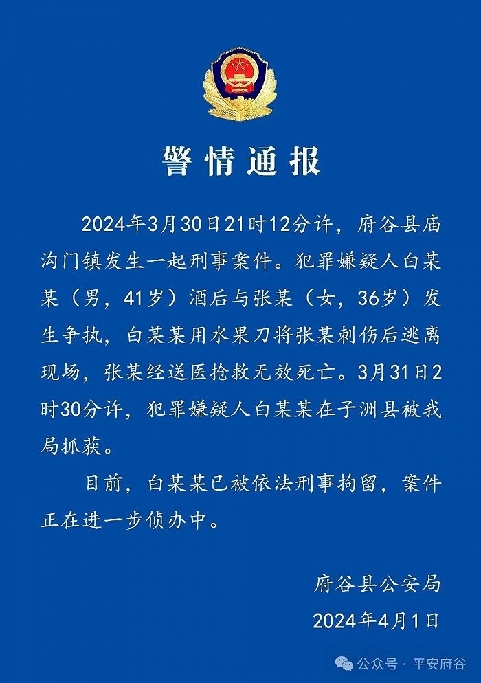 央視網(wǎng)消息:據(jù)陜西府谷縣公安局通報(bào),3月30日21時(shí)12分許,府谷縣廟溝門(mén)鎮(zhèn)發(fā)生一起刑事案件。犯罪嫌疑人白某某(男,41歲)酒后與張某(女,36歲)發(fā)生爭(zhēng)執(zhí),白某某用水果刀將張某刺傷后逃離現(xiàn)場(chǎng),張某經(jīng)送醫(yī)搶救無(wú)效死亡。3月31日2時(shí)30分許,犯罪嫌疑人白某某在子洲縣被府谷縣公安局抓獲。