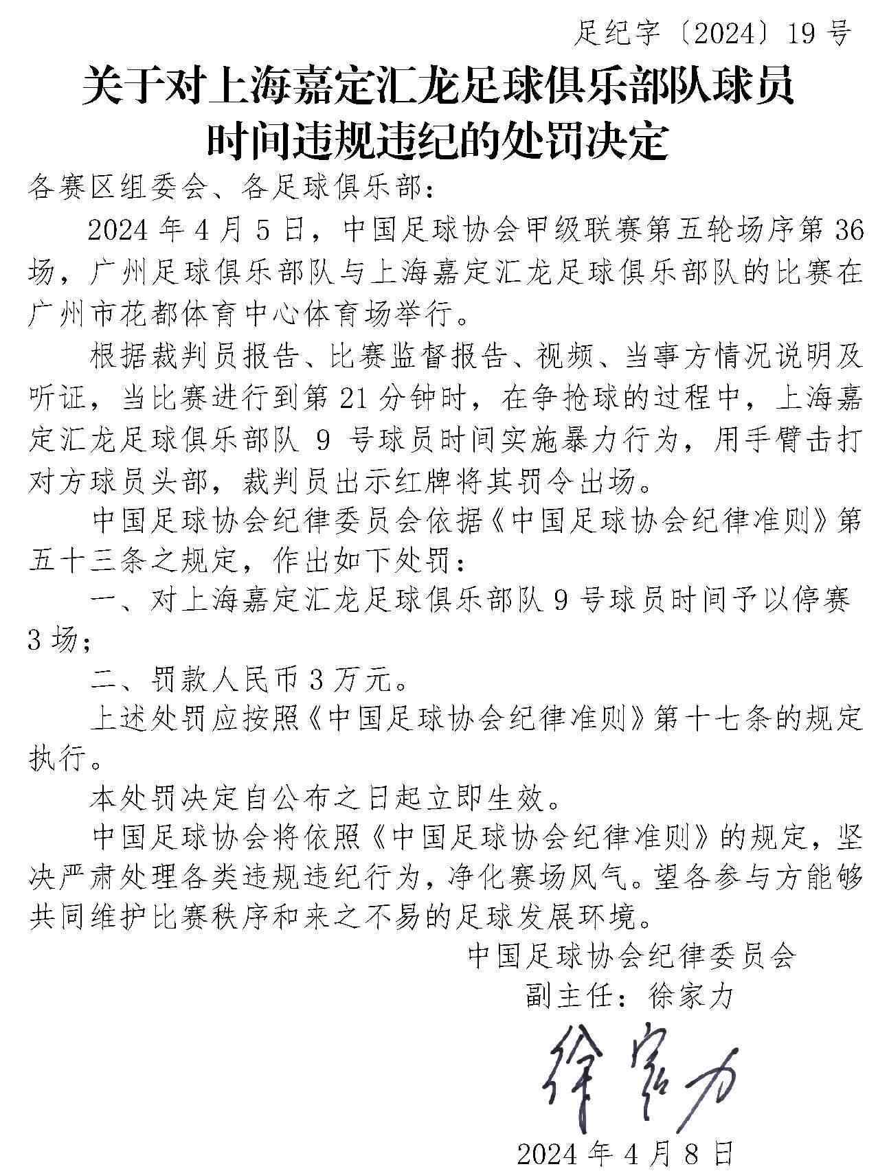 央視網(wǎng)消息:4月10日,中國(guó)足協(xié)網(wǎng)站發(fā)布《關(guān)于對(duì)上海嘉定匯龍足球俱樂部隊(duì)球員時(shí)間違規(guī)違紀(jì)的處罰決定》《關(guān)于對(duì)西安崇德榮海足球俱樂部隊(duì)違規(guī)違紀(jì)的處罰決定》《關(guān)于對(duì)大連鯤城足球俱樂部隊(duì)違規(guī)違紀(jì)的處罰決定》三份處罰決定。中甲聯(lián)賽上海嘉定匯龍9號(hào)球員因暴力行為被停賽罰款。中乙聯(lián)賽大連鯤城與西安崇德榮海兩家俱樂部因未按規(guī)定指派特定官員參加賽前聯(lián)席會(huì),被通報(bào)批評(píng)。