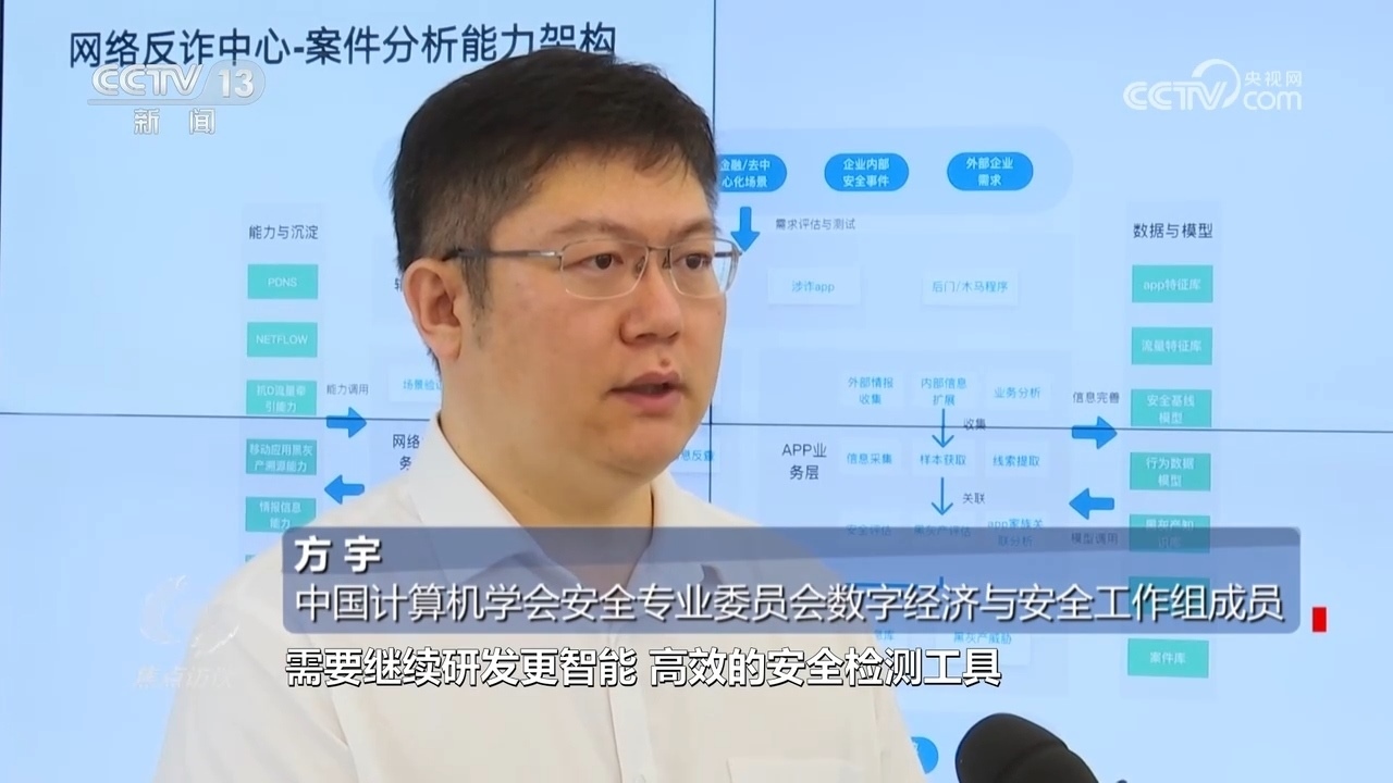 方宇:“下一步,針對涉詐APP的發(fā)現(xiàn),需要繼續(xù)研發(fā)更智能、高效的安全檢測工具,建立涉詐APP的黑名單數(shù)據(jù)庫。另外,結(jié)合一些新型、智能化的技術(shù)手段,通過對網(wǎng)絡(luò)流量分析,及時發(fā)現(xiàn)詐騙流量,并通過公安、網(wǎng)信、金融、市場監(jiān)管等部門進(jìn)一步加強(qiáng)聯(lián)動、信息及時共享、及時進(jìn)行阻斷,多措并舉,共同努力,形成合力,打擊涉詐APP?!?/p>