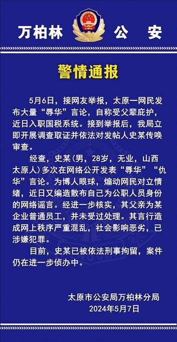 ·太原警方:一男子發(fā)表“辱華”“仇華”言論并編造公職人員身份,已被拘留。
