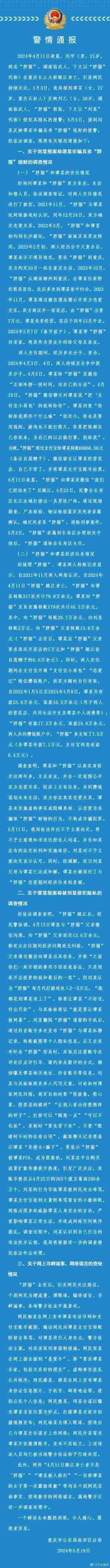 5月19日,重慶警方發(fā)布關(guān)于劉某(男,21歲,網(wǎng)名“胖貓”)在重慶長江大橋跳江身亡事件相關(guān)情況的通報(bào)。通報(bào)詳情如下: