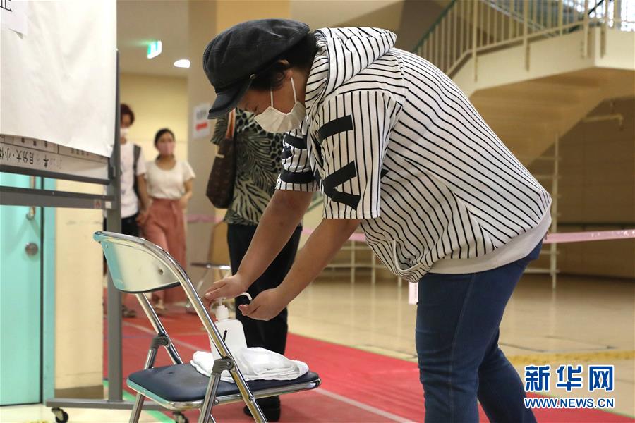 7月5日,選民在日本東京的一個投票點入口使用消毒液。日本東京都知事選舉于5日舉行投票。新華社記者杜瀟逸攝