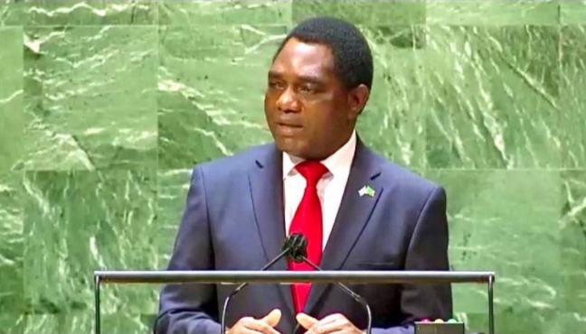 △贊比亞總統(tǒng)希奇萊馬在聯(lián)合國(guó)大會(huì)一般性辯論上發(fā)言