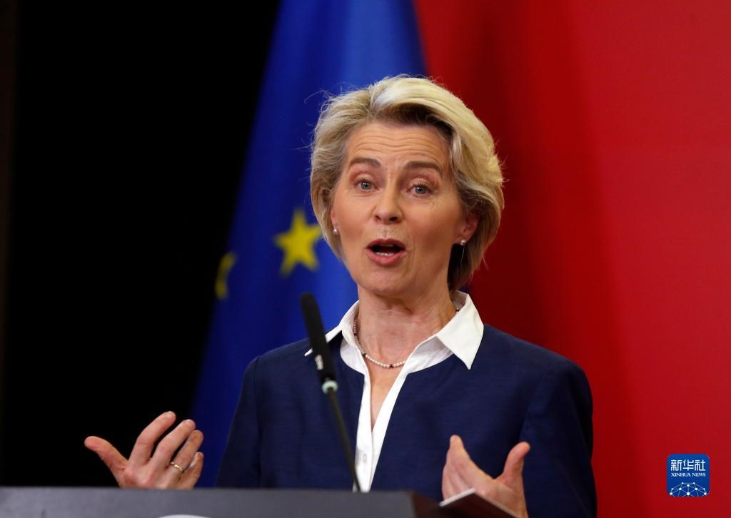 10月26日,在北馬其頓斯科普里,歐盟委員會(huì)主席馮德萊恩在與北馬其頓總理科瓦切夫斯基(不在畫(huà)面中)舉行的聯(lián)合新聞發(fā)布會(huì)上講話。新華社發(fā)(托米斯拉夫·格奧爾基耶夫 攝)