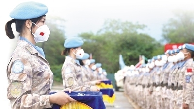 2022年9月30日,中國第八批赴南蘇丹(朱巴)維和步兵營700名維和官兵被聯(lián)合國授予“和平榮譽(yù)勛章”,以表彰他們?cè)趫?zhí)行維和任務(wù)期間的卓越表現(xiàn)和為南蘇丹和平事業(yè)作出的突出貢獻(xiàn)。圖為授勛儀式現(xiàn)場(chǎng)。 孫雪松攝(新華社發(fā))