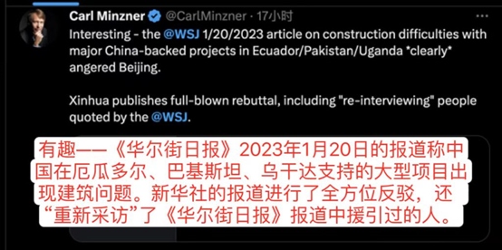 美國(guó)福特漢姆大學(xué)教授、美國(guó)外交關(guān)系協(xié)會(huì)中國(guó)問(wèn)題高級(jí)研究員明克勝轉(zhuǎn)發(fā)了新華社的報(bào)道,并稱:有趣——《華爾街日?qǐng)?bào)》2023年1月20日的報(bào)道稱中國(guó)在厄瓜多爾、巴基斯坦、烏干達(dá)支持的大型項(xiàng)目出現(xiàn)建筑問(wèn)題。新華社的報(bào)道進(jìn)行了全方位反駁,還“重新采訪”了《華爾街日?qǐng)?bào)》報(bào)道中援引過(guò)的人。