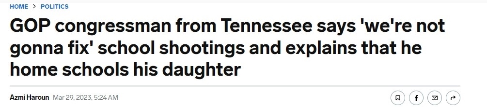 據(jù)美國(guó)《商業(yè)內(nèi)幕》新聞網(wǎng)站29日?qǐng)?bào)道,田納西州納什維爾市小學(xué)發(fā)生槍擊事件后,該州眾議院議員蒂姆·伯切特面對(duì)如果出現(xiàn)類(lèi)似槍擊事件“該如何保護(hù)孩子”的質(zhì)問(wèn),直言并未找到解決方法,會(huì)讓他的女兒“在家讀書(shū)”。