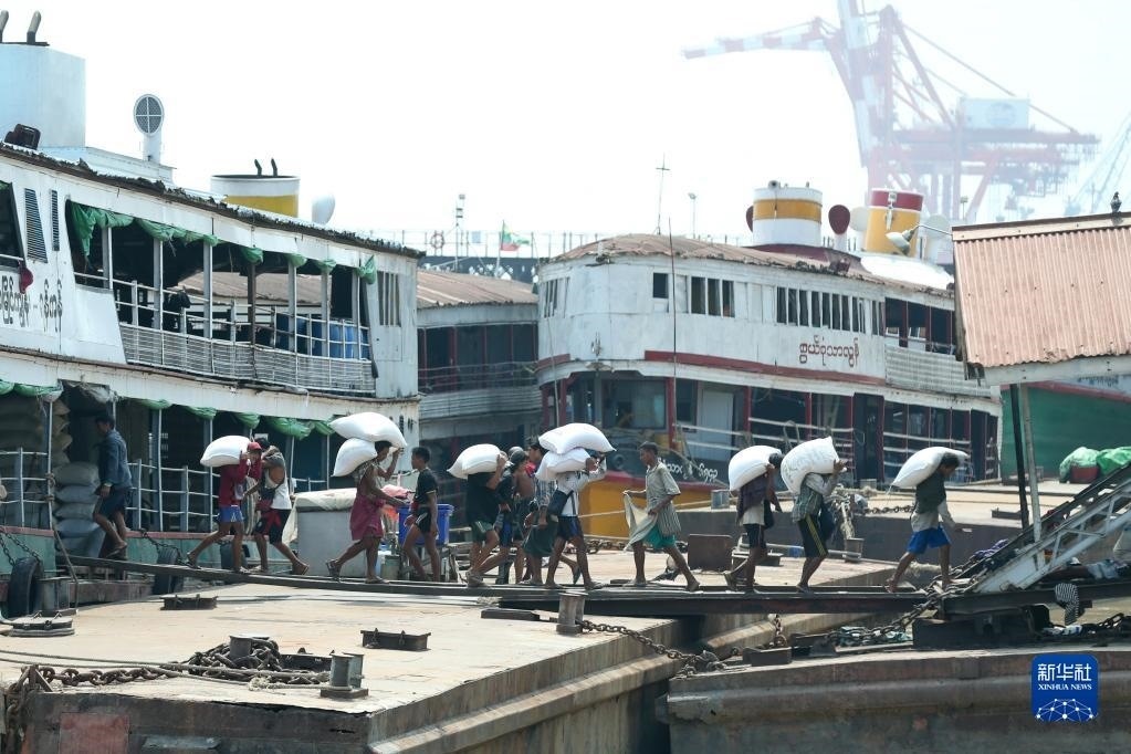 4月27日,工人在緬甸仰光一處碼頭搬運大米。