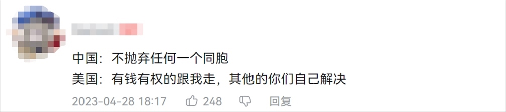 這段視頻引起很多網(wǎng)友的討論,其中有網(wǎng)友簡單總結(jié)了中美撤僑行動(dòng)的不同?!?/p>