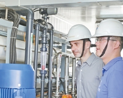 在巴西北里奧格蘭德州若昂卡馬拉市,中國國家電網(wǎng)巴西電力股份公司員工在檢查凈水設(shè)備。該苦咸水淡化公益項(xiàng)目讓800多個(gè)家庭喝上優(yōu)質(zhì)飲用水。 新華社記者 陳昊佺攝