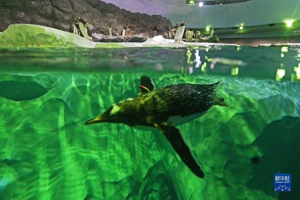這是5月8日新加坡飛禽公園開放當天拍攝的潛水的企鵝。