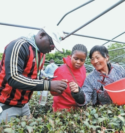 4月21日,在山東泰安道朗鎮(zhèn),非洲青年代表向茶農(nóng)學(xué)習(xí)采摘知識。本報(bào)記者 陳尚文攝
