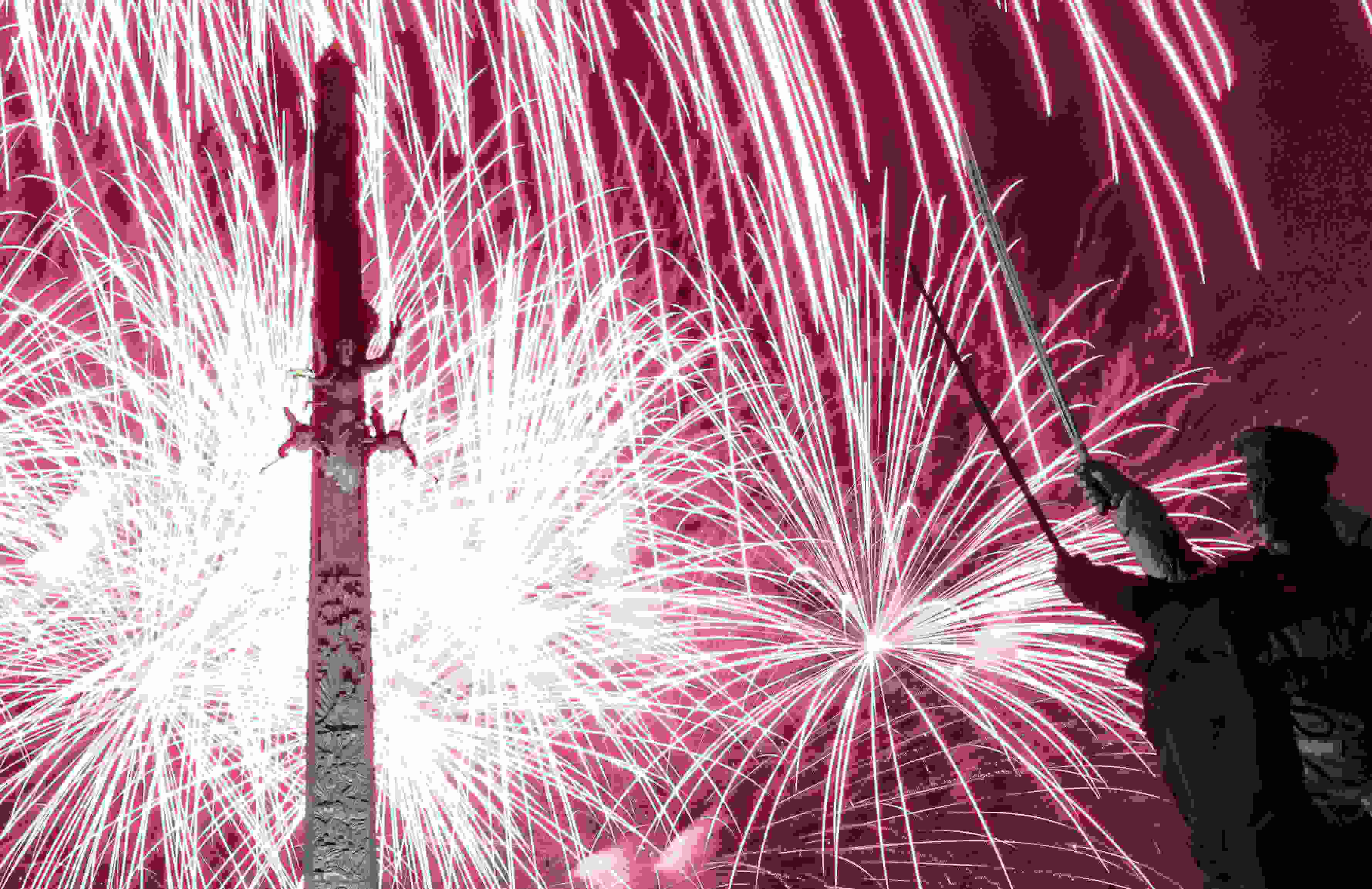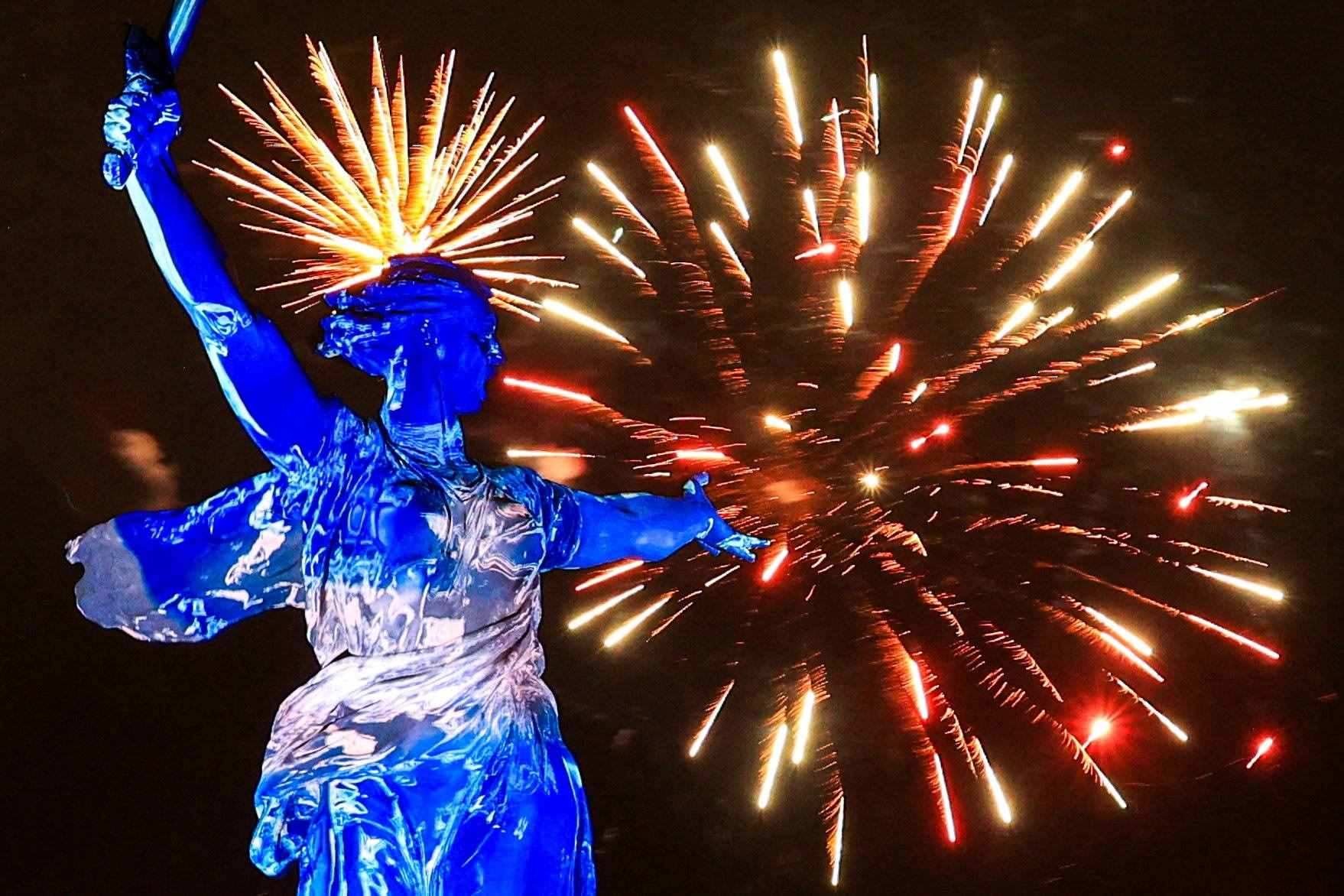 當(dāng)?shù)貢r間2023年5月9日,俄羅斯伏爾加格勒,紀(jì)念衛(wèi)國戰(zhàn)爭勝利78周年,煙花在馬馬耶夫山崗的祖國召喚雕像上綻放。