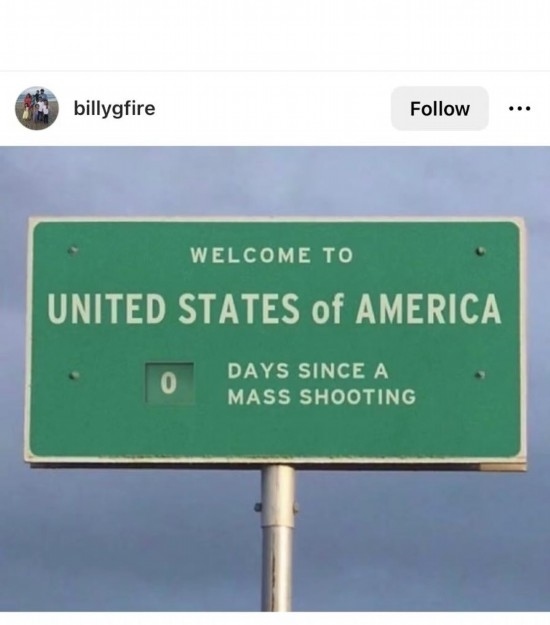 網(wǎng)友Billygfire創(chuàng)作了一塊高速公路廣告牌,上面寫(xiě)道:“歡迎來(lái)到美國(guó),距離上一次大規(guī)模槍擊已經(jīng)過(guò)了0天?!?/strong>