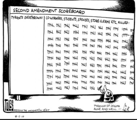 這幅漫畫(huà)題為《第二修正案“得分板”》,右邊顯示因?yàn)榈诙拚杆劳龅耐隆W(xué)生、配偶、商店售貨員等各色人等。美國(guó)憲法第二修正案是美國(guó)公民擁槍的主要法律依據(jù)。