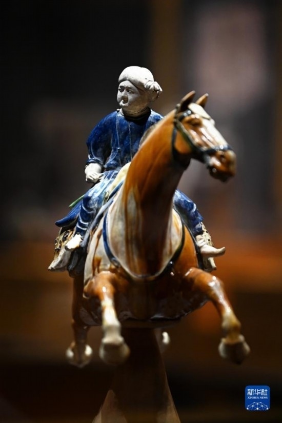 5月8日,游客在西安博物院參觀唐代三彩騰空馬。飛騰的三彩馬上騎有一胡俑,真實再現(xiàn)了絲綢之路上西域胡人急奔長安的生動形象。