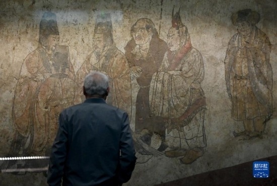 5月11日,游客在陜西歷史博物館內(nèi)觀看唐章懷太子墓《客使圖》?!犊褪箞D》描繪的是唐代外交機構(gòu)鴻臚寺官員接待外國使節(jié)的場景。