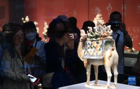 5月11日,游客在陜西歷史博物館參觀唐三彩駱駝載樂俑。這件唐三彩駱駝載樂俑既是唐代文化藝術(shù)、制作工藝發(fā)達昌盛的重要物證,也見證了絲綢之路上藝術(shù)的交流與融合。