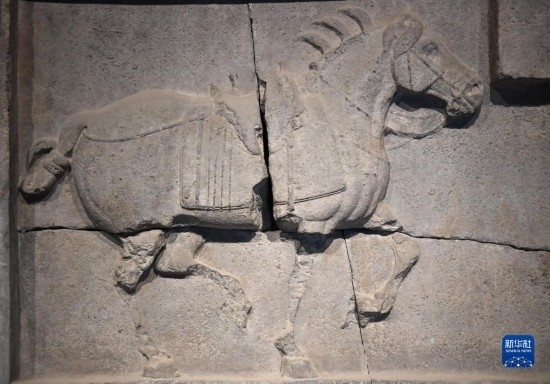 這是在西安碑林博物館內(nèi)拍攝的昭陵六駿石雕特勤驃(5月9日攝)。唐昭陵六駿石刻是為紀念六匹隨唐太宗李世民征戰(zhàn)疆場的戰(zhàn)馬而刻制的,其中特勤驃等馬匹帶有明顯的西域良馬特征。