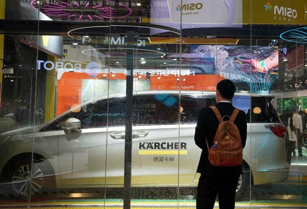 2021年11月6日,觀眾在第四屆進(jìn)博會(huì)德國卡赫展臺(tái)參觀全自動(dòng)洗車機(jī)器人的演示。(新華社記者劉穎攝)