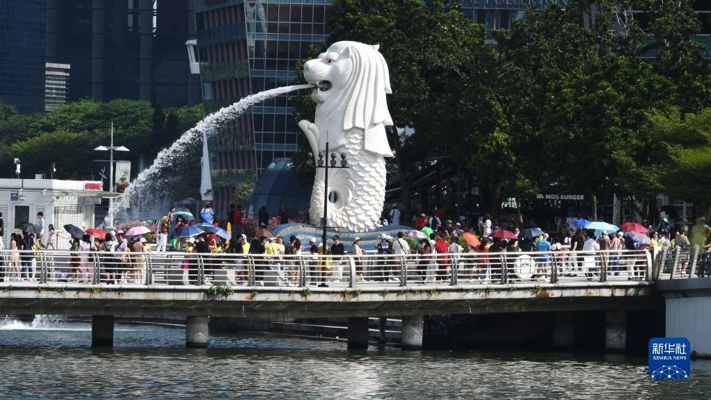 5月18日,在新加坡濱海灣,很多人用傘遮陽。