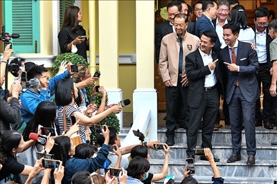 當?shù)貢r間2023年5月17日,泰國曼谷,泰國遠進黨黨魁皮塔與泰國為泰黨黨魁春拉南在與聯(lián)盟伙伴舉行會議后合影。