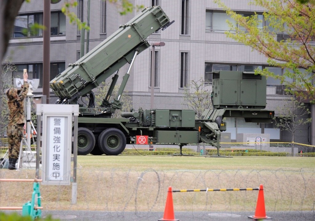 2013年4月9日,在日本東京的防衛(wèi)省總部,“愛國者3型”導彈發(fā)射裝置停放在運動場內(nèi)。新華社發(fā)(關(guān)賢一郎攝)