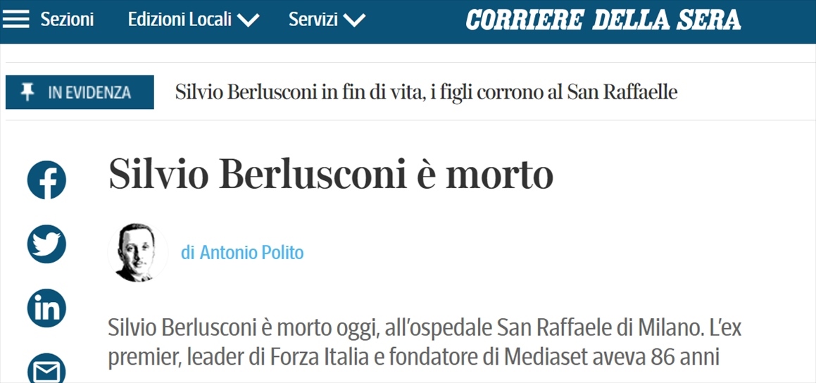 【環(huán)球網(wǎng)快訊】據(jù)俄新社12日援引意大利《晚郵報》的報道稱,意大利前總理貝盧斯科尼去世,終年86歲。另據(jù)法新社報道,意大利前總理貝盧斯科尼的發(fā)言人向該媒體證實,貝盧斯科尼已經(jīng)去世。