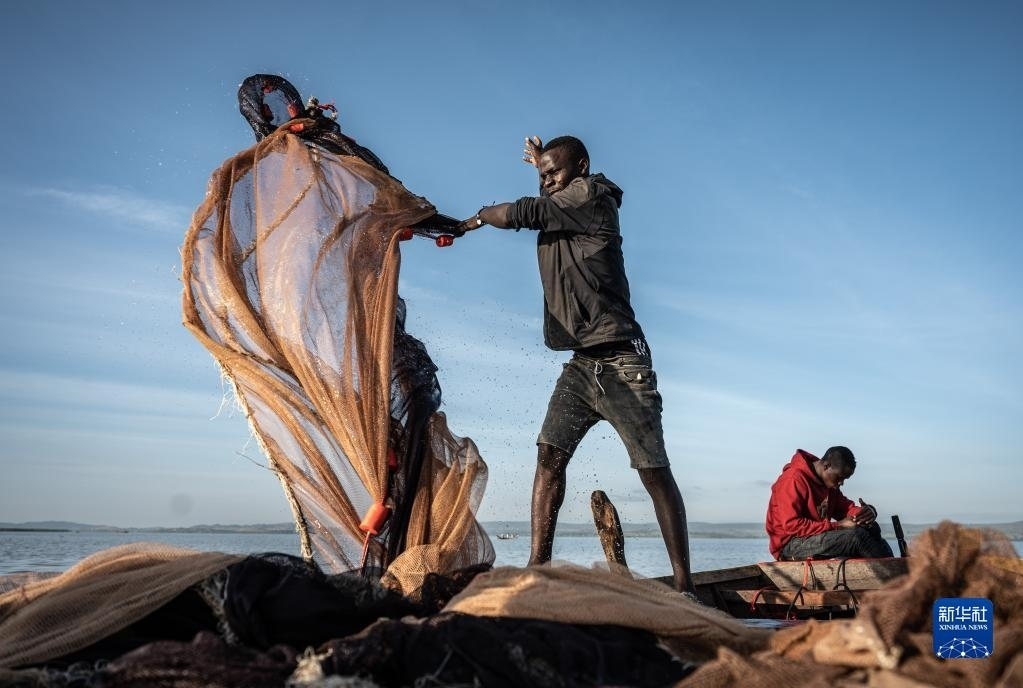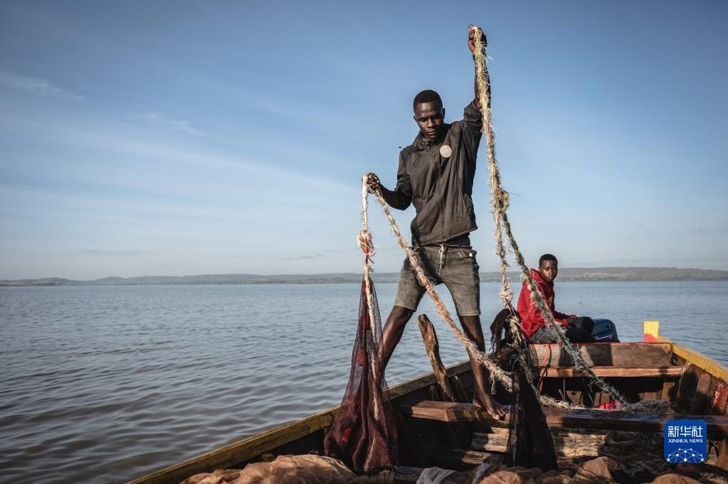 6月10日,坦桑尼亞姆萬扎省維多利亞湖畔的漁民整理漁網(wǎng)。
