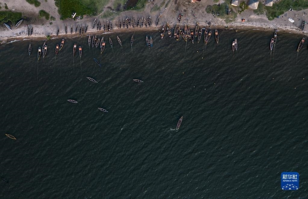 這是6月11日拍攝的坦桑尼亞姆萬扎省維多利亞湖畔的漁船(無人機照片)。